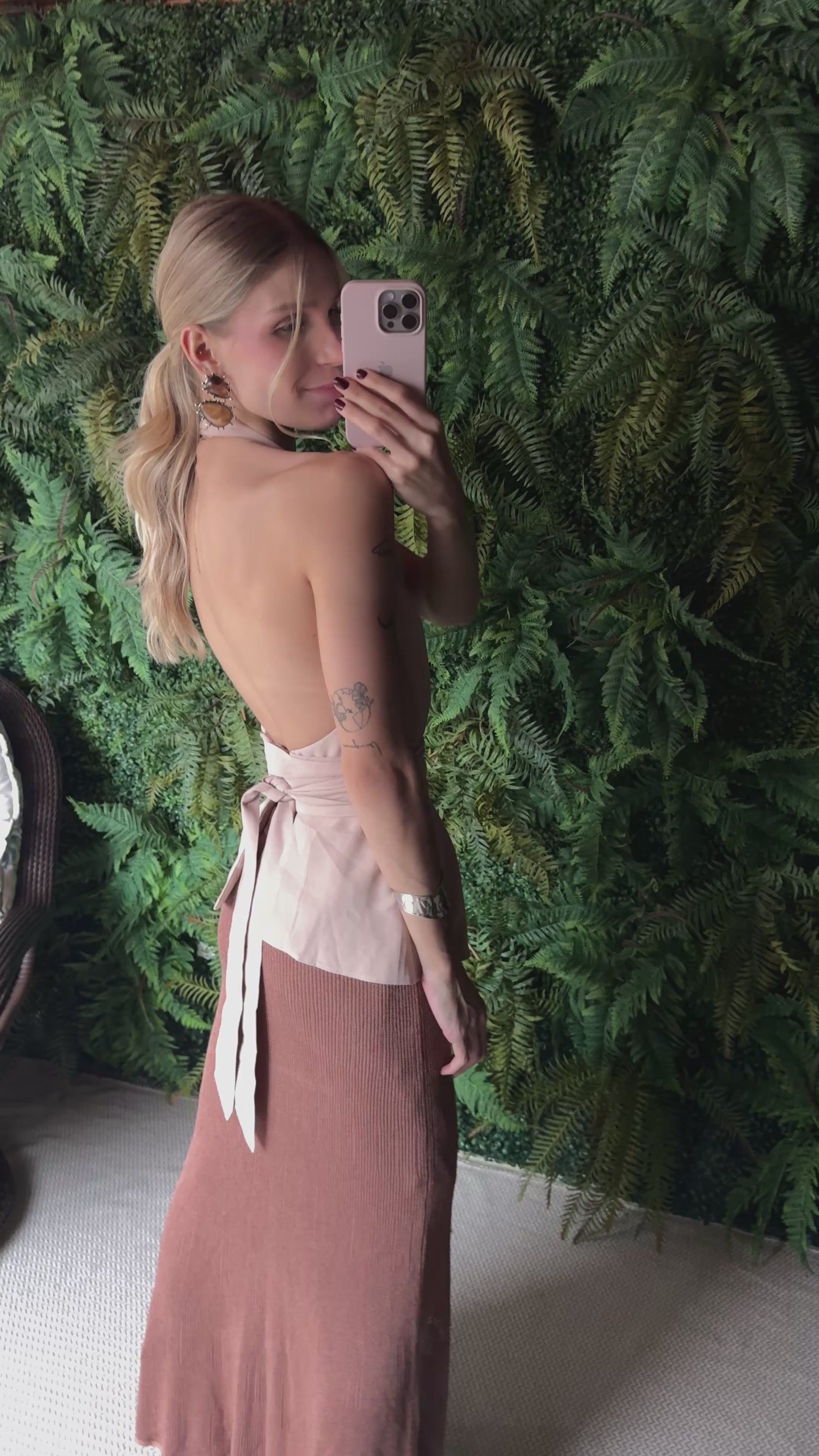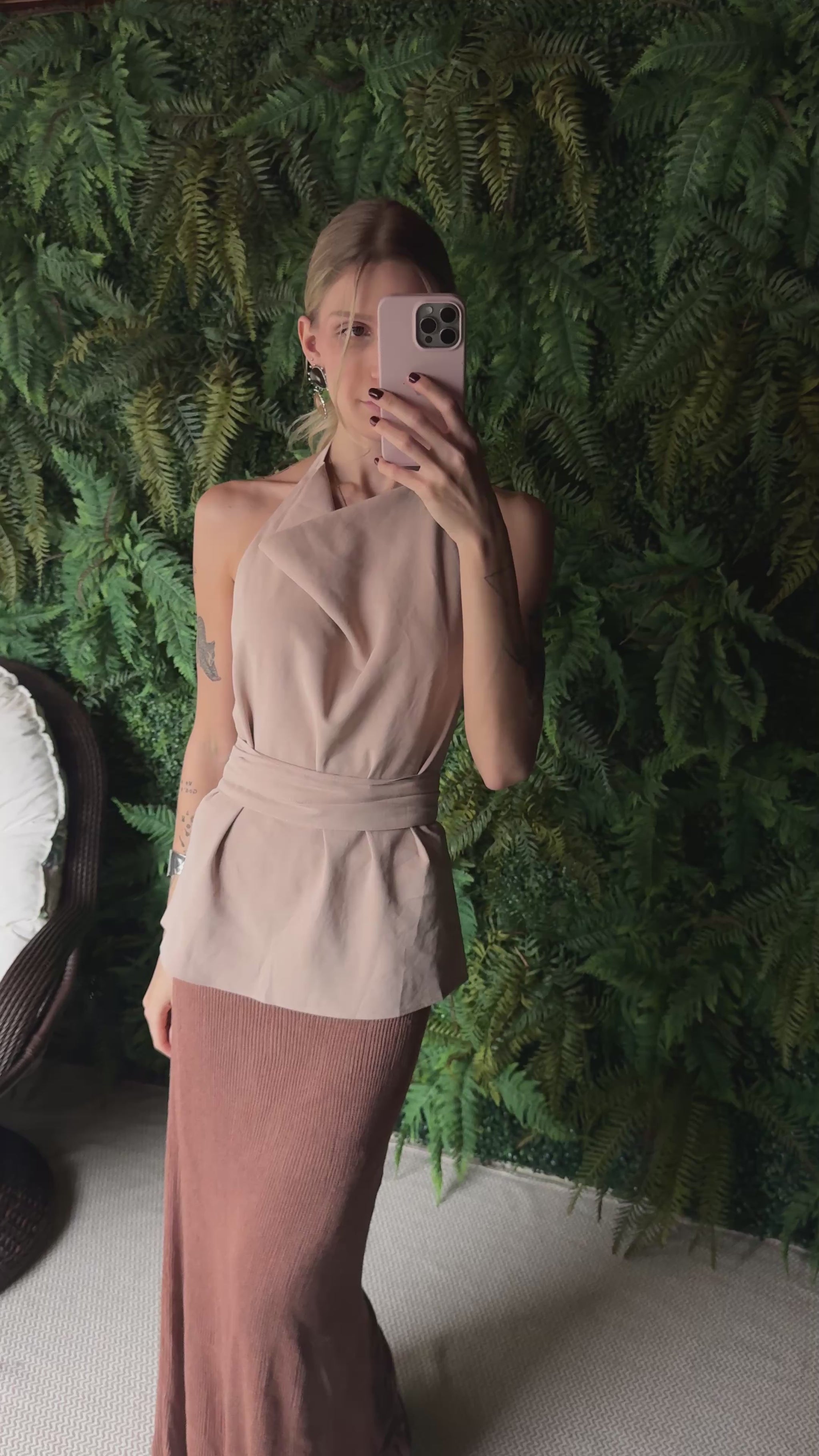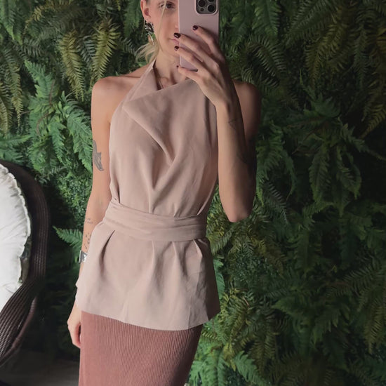 Blusa com decote degage, frente única e com faixa para amarração.